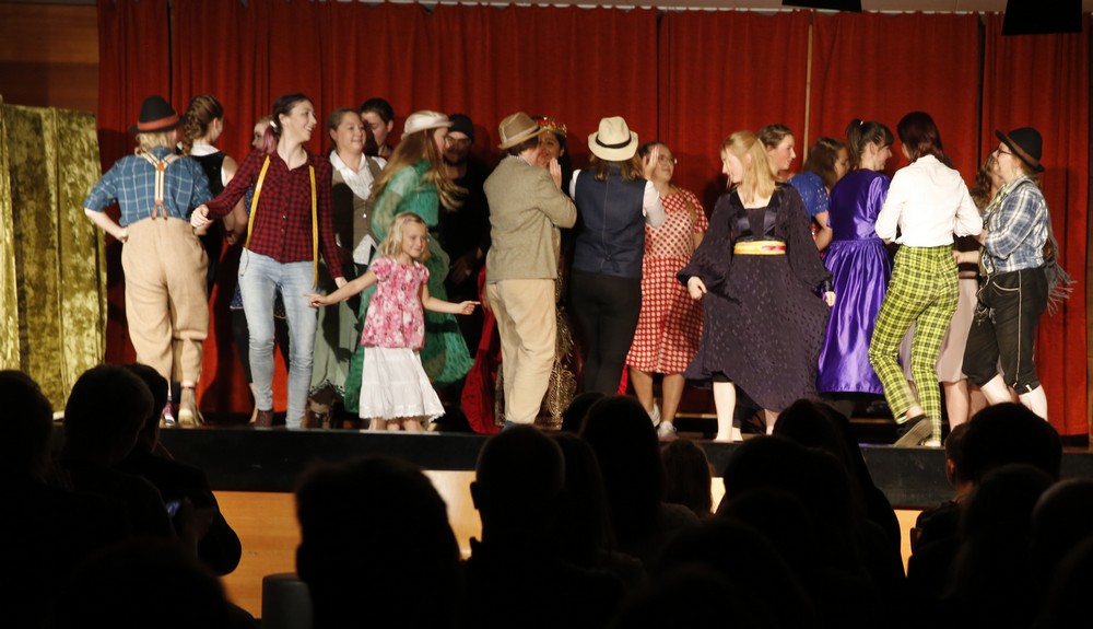 3 Handwerker wurden verdoppelt; sie ergänzten, parodierten, spiegelten sich und überzeugten mit ihrer Spielfreude und sprachlichen Virtuosität. Die vielen anderen Rollen machten das Stück zu einem Feuerwerk des Bühnenspiels.