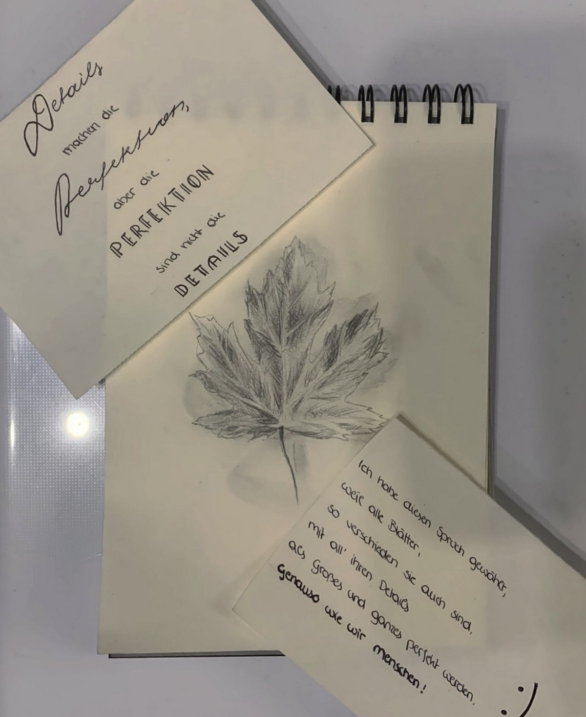 Naturstudium und gegenständliches Zeichnen sind unter anderem Inhalte der Bildnerischen Erziehung in der 2. Klasse. Im eigenen Skizzenbuch, das jede/r Schüler/in in der 1. Klasse auch zur privaten Verwendung von uns bekommt, ließ sich der kleine Arbeitsauftrag aus dem Distance Learning gut umsetzen – Wähle ein Zitat über das Naturstudium und interpretiere es mit einer eigenen Zeichnung, indem du ein Stück Natur draußen zeichnest oder es dir nach drinnen holst und es „studierst“ (Maßverhältnisse, Aufbau, Oberflächenbeschaffenheit, das „Wesen“ erfassen und zeigen).