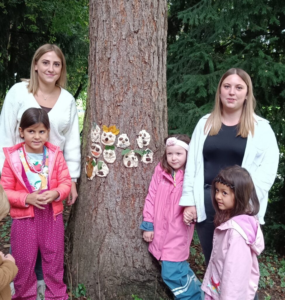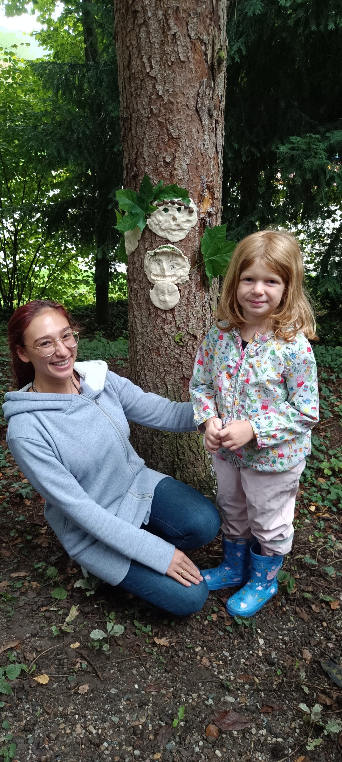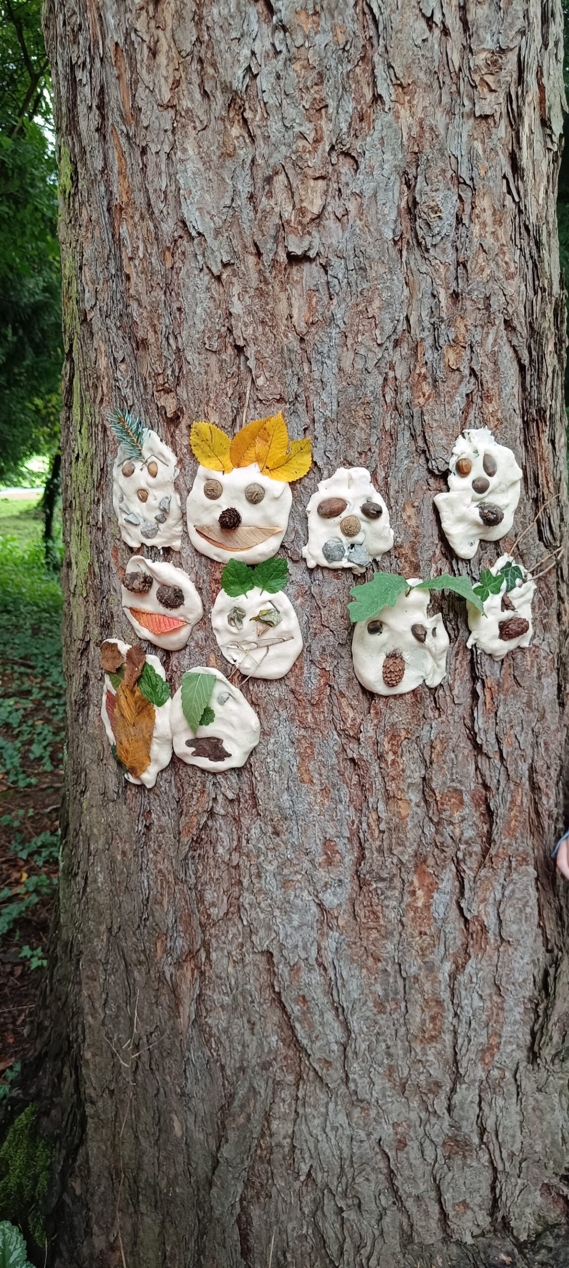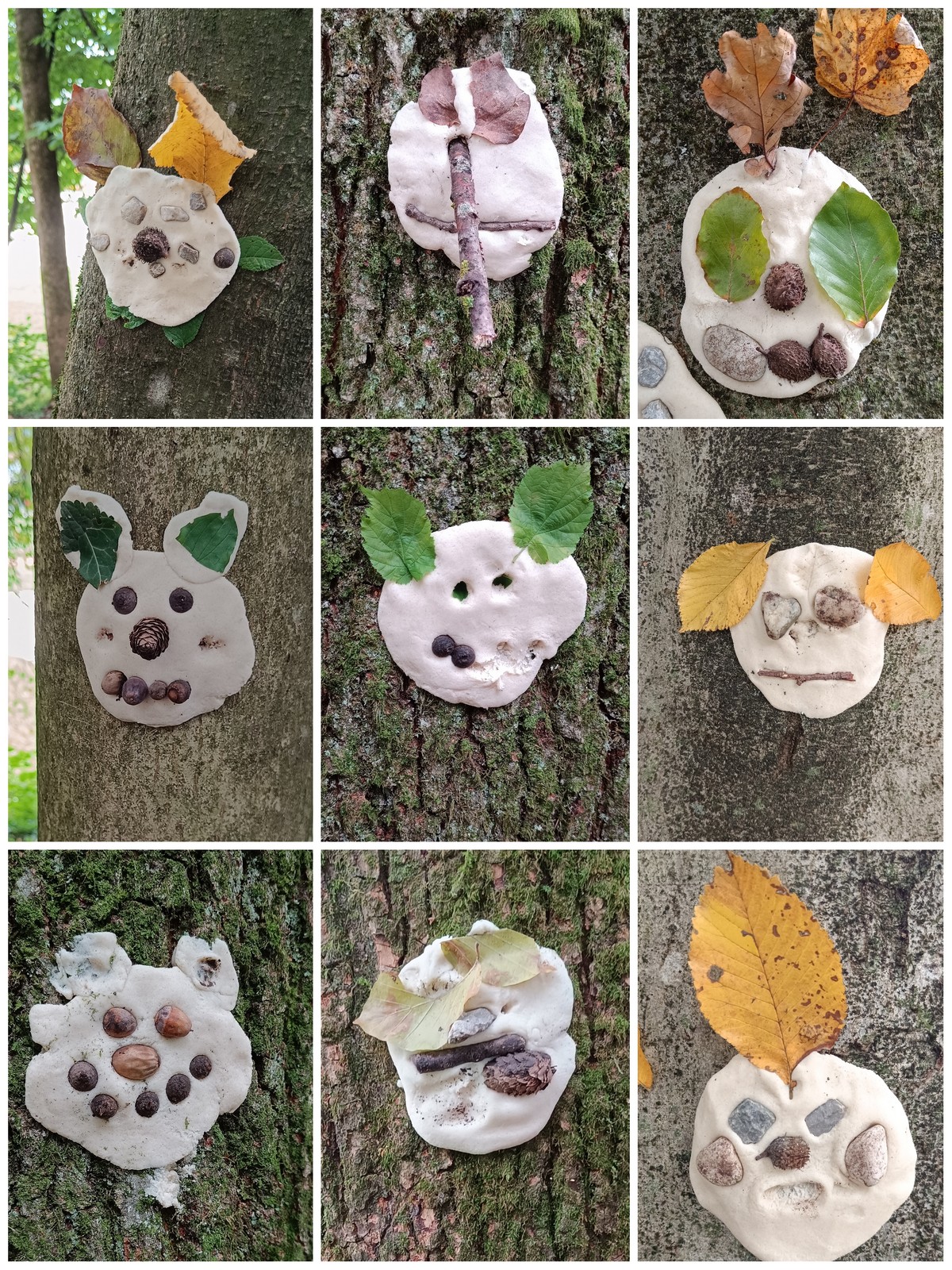 Ganz im Sinne des Praxistransfers stellte das 1 KT im Werkunterricht Salzteig her. Anschließend wurden Kinder des Praxiskindergartens abgeholt. Gemeinsam wanderten wir zu dem am Borromäumsgelände gelegenen Waldstück. In Eins-zu-eins-Betreuung wählte jedes Kind einen Baum aus, brachte Salzteig am Baumstamm an und gestaltete mit umliegendem Naturmaterial ein individuelles Gesicht. Ein gemeinsamer Rundgang, um alle Baumgesichter bewundern zu können – inklusive Erinnerungsfoto – schloss die Einheit ab.