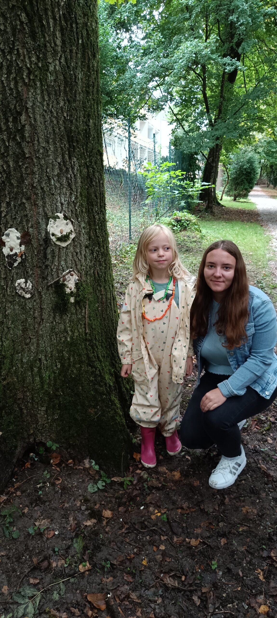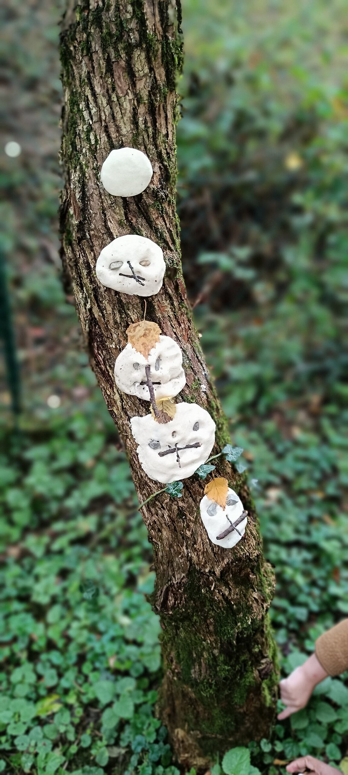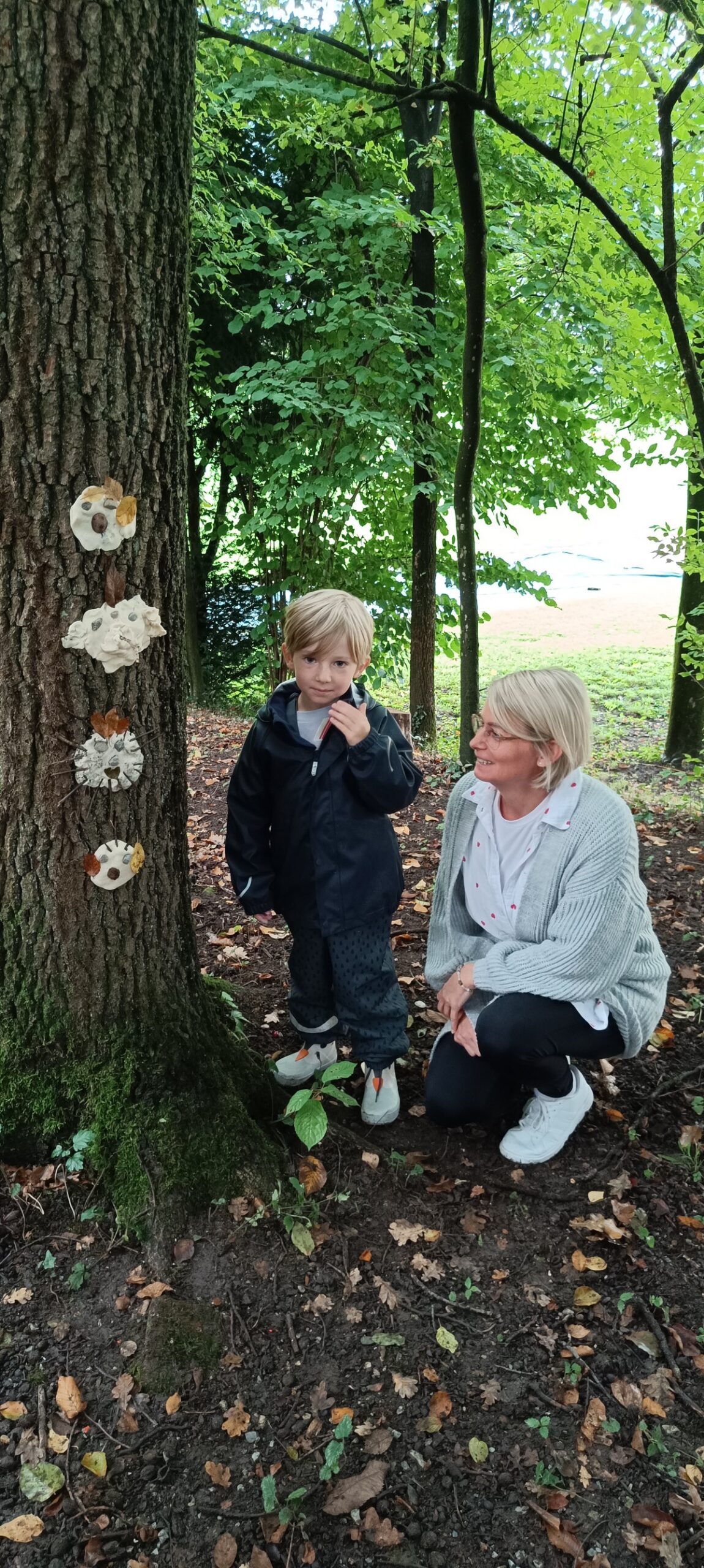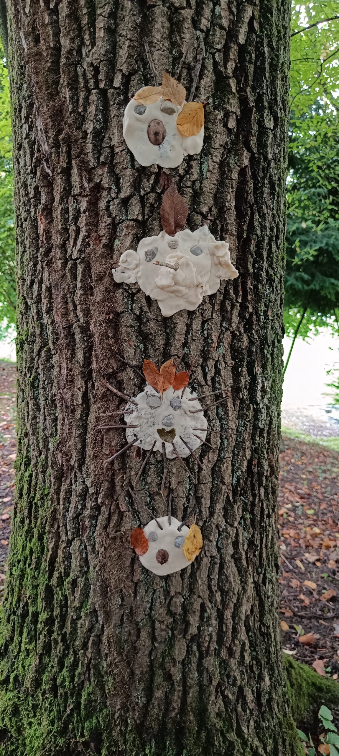 Ganz im Sinne des Praxistransfers stellte das 1 KT im Werkunterricht Salzteig her. Anschließend wurden Kinder des Praxiskindergartens abgeholt. Gemeinsam wanderten wir zu dem am Borromäumsgelände gelegenen Waldstück. In Eins-zu-eins-Betreuung wählte jedes Kind einen Baum aus, brachte Salzteig am Baumstamm an und gestaltete mit umliegendem Naturmaterial ein individuelles Gesicht. Ein gemeinsamer Rundgang, um alle Baumgesichter bewundern zu können – inklusive Erinnerungsfoto – schloss die Einheit ab.