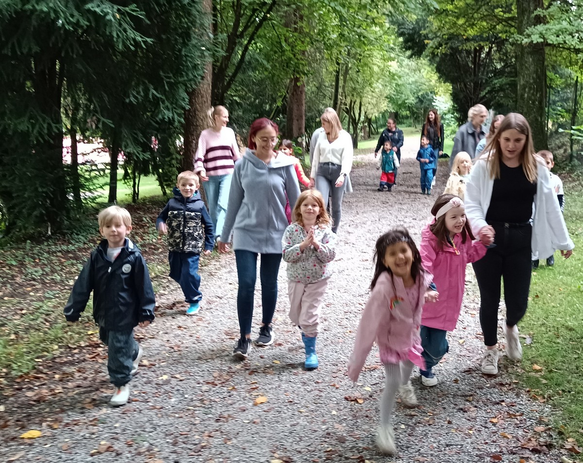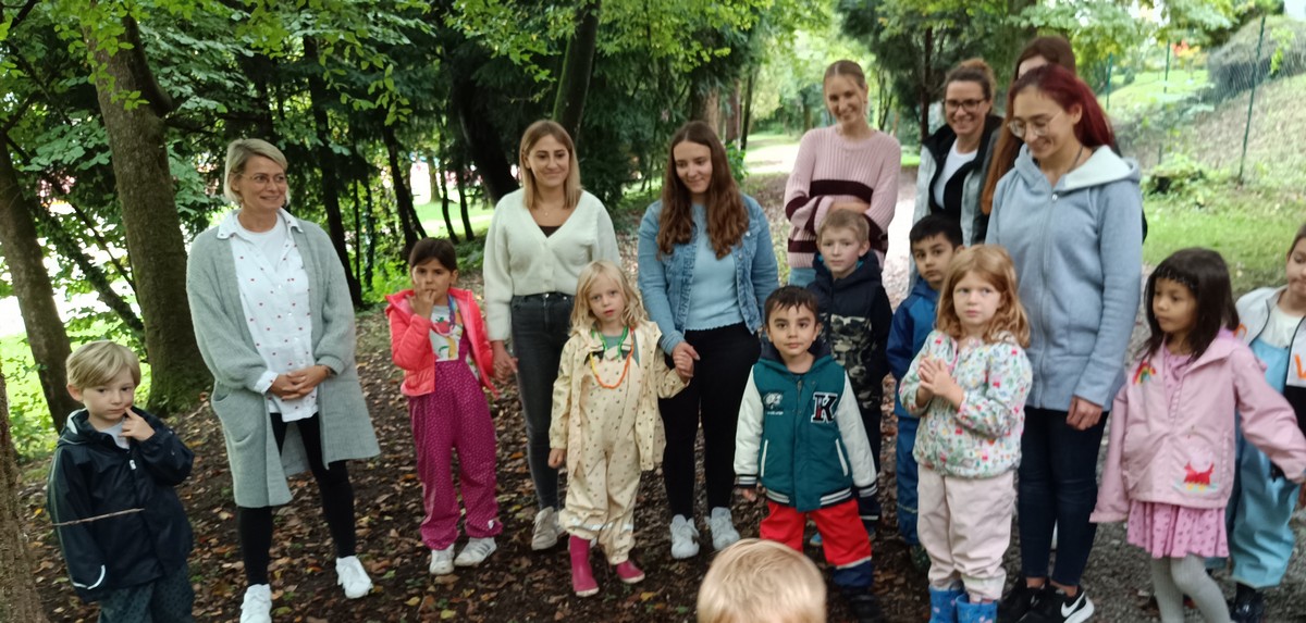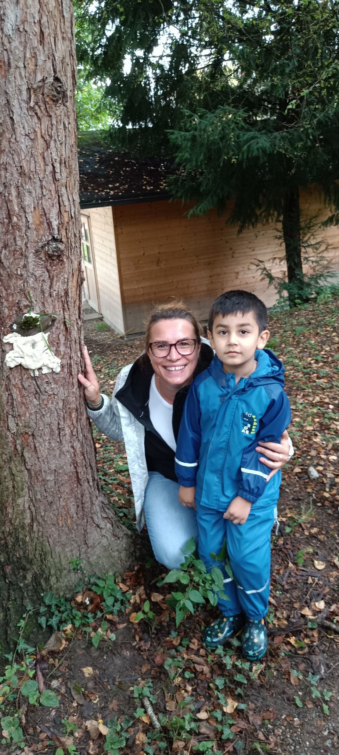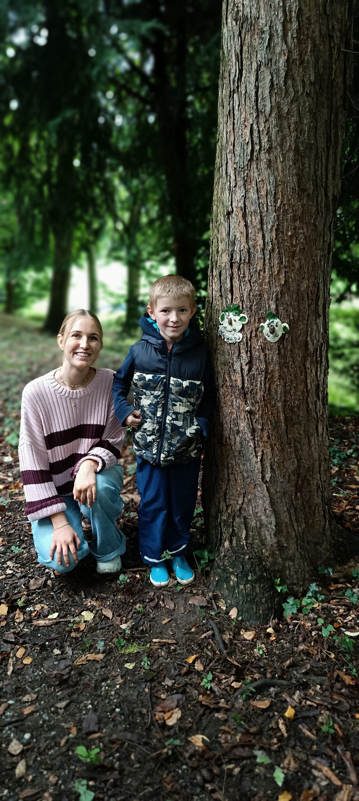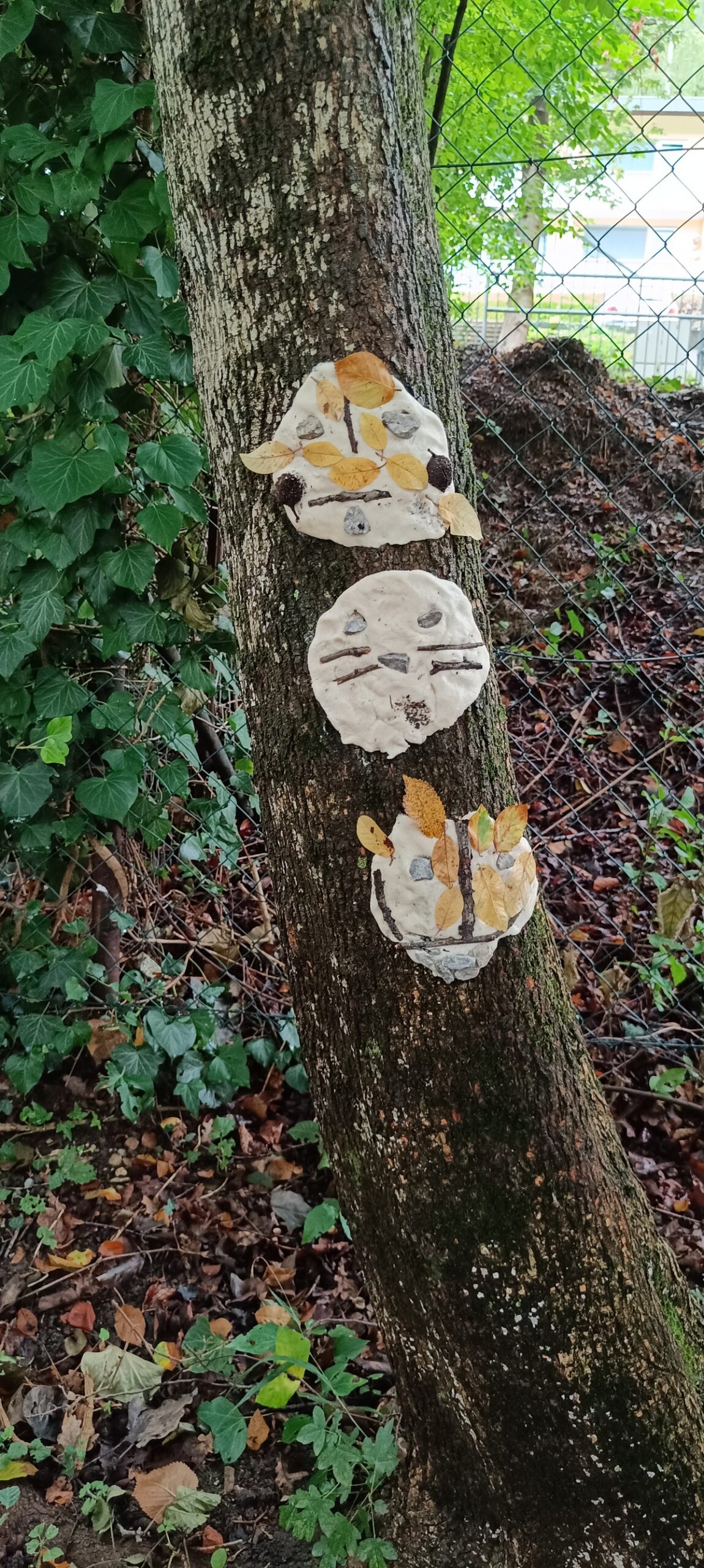 Ganz im Sinne des Praxistransfers stellte das 1 KT im Werkunterricht Salzteig her. Anschließend wurden Kinder des Praxiskindergartens abgeholt. Gemeinsam wanderten wir zu dem am Borromäumsgelände gelegenen Waldstück. In Eins-zu-eins-Betreuung wählte jedes Kind einen Baum aus, brachte Salzteig am Baumstamm an und gestaltete mit umliegendem Naturmaterial ein individuelles Gesicht. Ein gemeinsamer Rundgang, um alle Baumgesichter bewundern zu können – inklusive Erinnerungsfoto – schloss die Einheit ab.