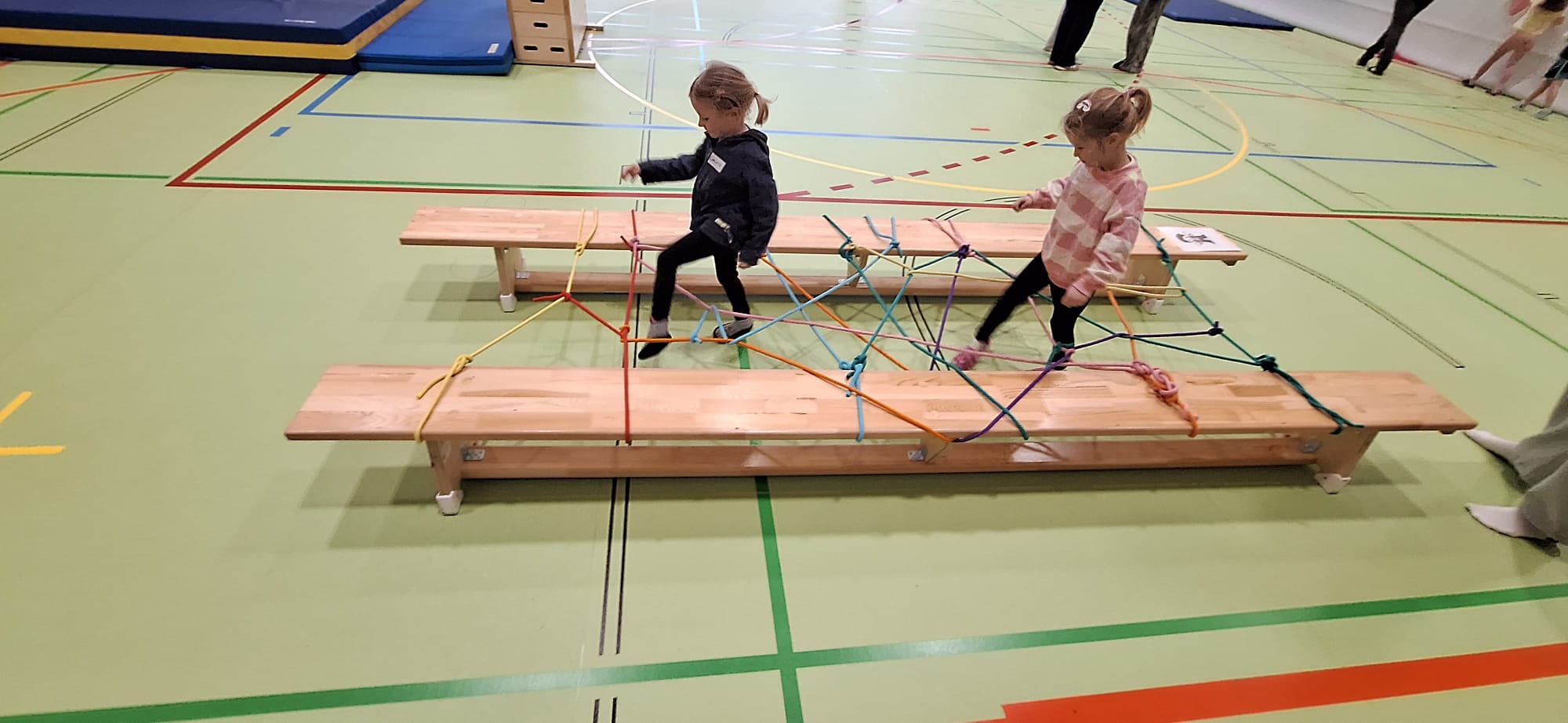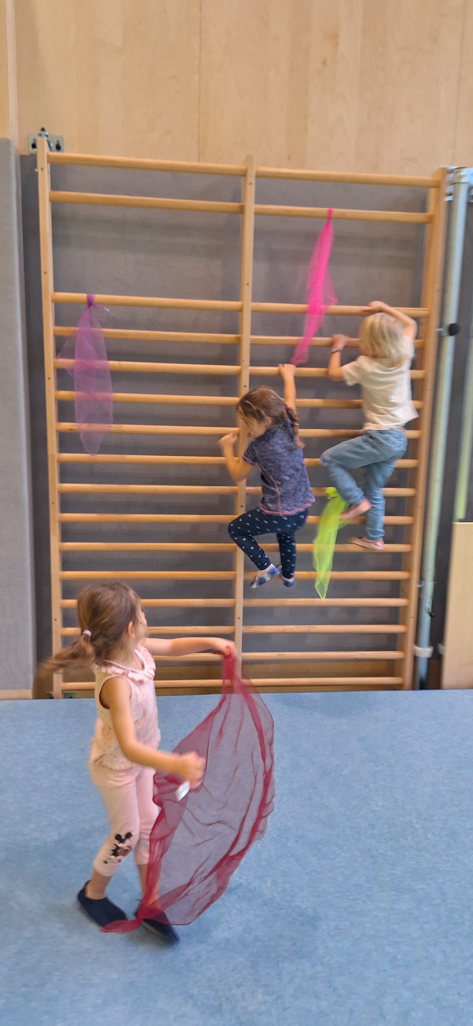 Der Turnsaal wird jeweils passend zum Thema in eine fantasievolle Bewegungslandschaft (z.B. Piratenschiff) verwandelt. Die Kindergartenkinder werden von den Schüler:innen abgeholt und mit einem motivierenden Lied in den Turnsaal begleitet. Dort werden die einzelnen Stationen kindgerecht erklärt. Ein besonderer Vorteil der Bewegungslandschaft liegt in ihrer hohen Differenzierungsmöglichkeit: Die Stationen können flexibel an den individuellen Könnensstand der Kinder angepasst werden – von zusätzlichen Herausforderungen bis hin zu gezielter Unterstützung.