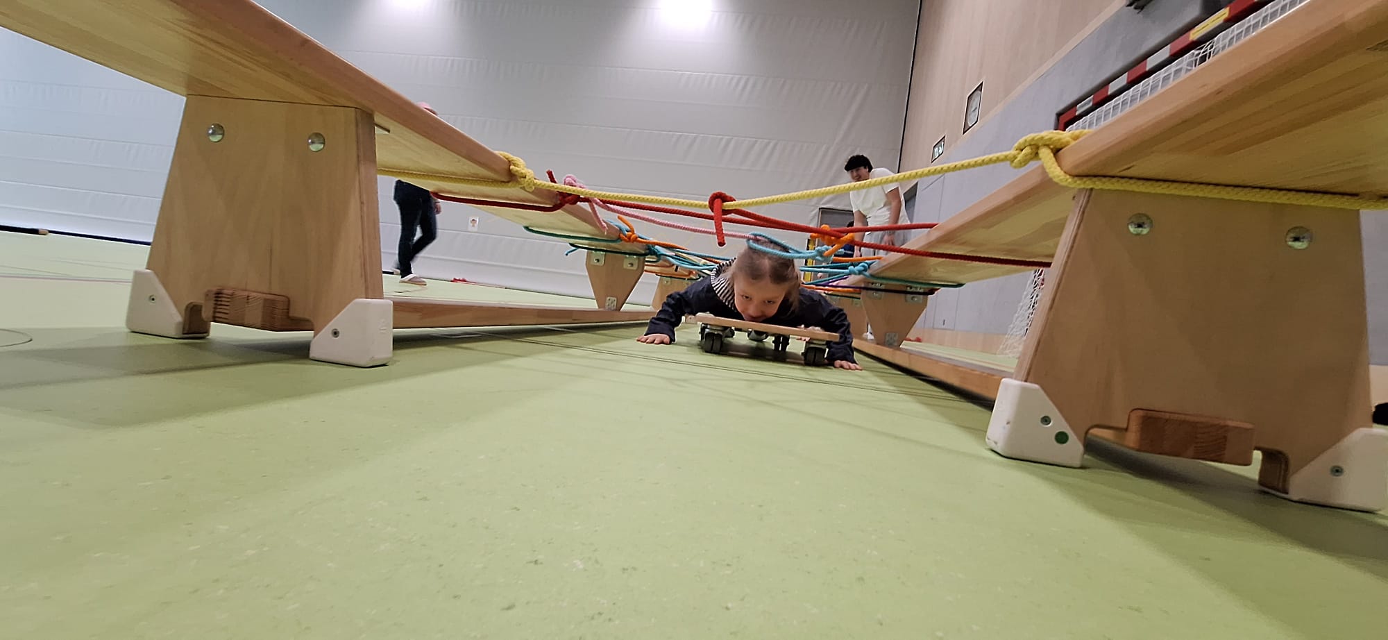 Durch diese offene und vielseitige Bewegungsform können die Kinder ihre motorischen Grundfertigkeiten wie Laufen, Springen, Klettern, Hangeln, Rollen, Schwingen u.v.m. spielerisch festigen. Gleichzeitig fördert die Bewegungslandschaft Selbstständigkeit, Selbstvertrauen und Freude an Bewegung.